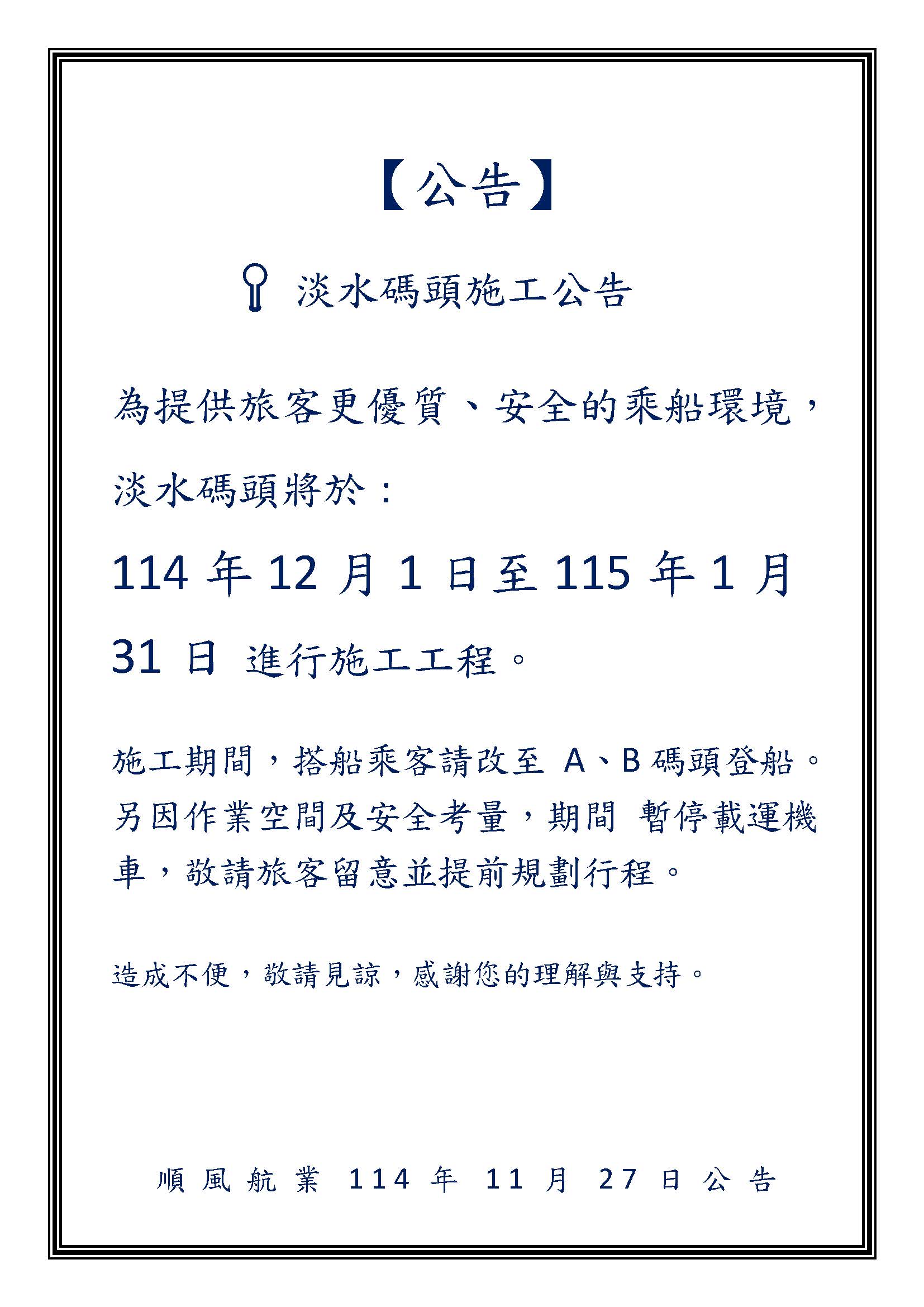 114年12月31日至115年01月31日淡水碼頭施工公告(詳見公告內文)