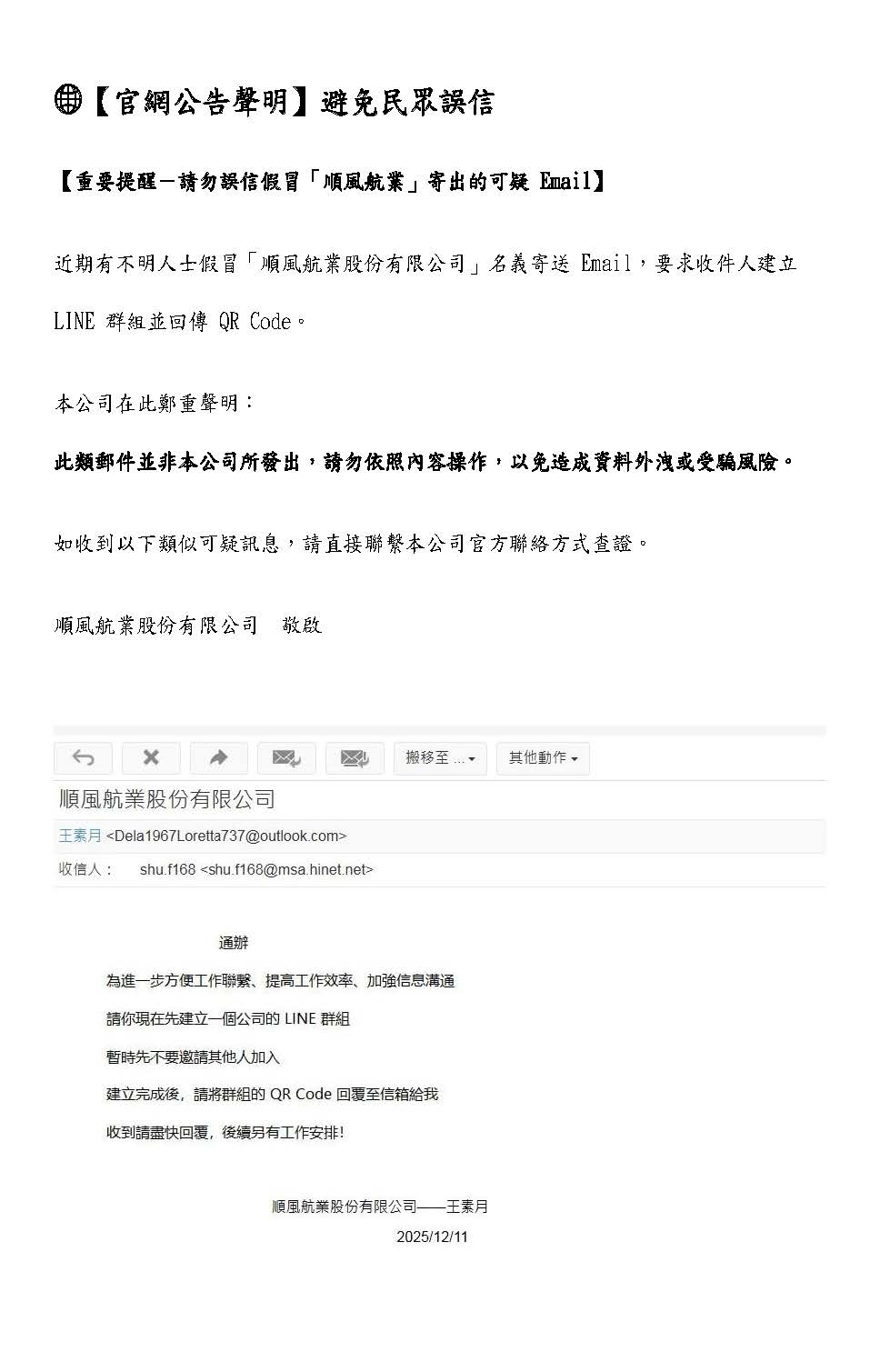 【重要提醒-請勿誤信假冒「順風航業」寄出的可疑 Email】