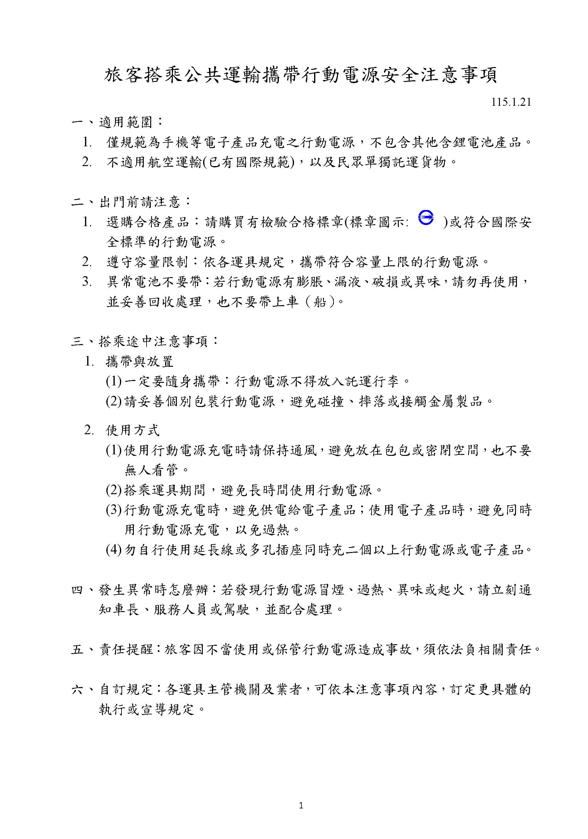 旅客搭乘公共運輸攜帶行動電源安全注意事項